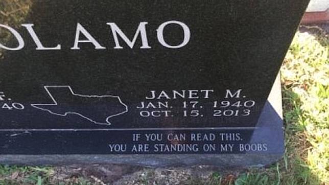Lihat kocaknya kalimat di batu nisan ini!Tertulis 'If You Can Read This, You Are Standing On My B*obs', yang berarti 'Jika kamu bisa membaca ini berarti kamu berdiri di atas buah dadaku'.