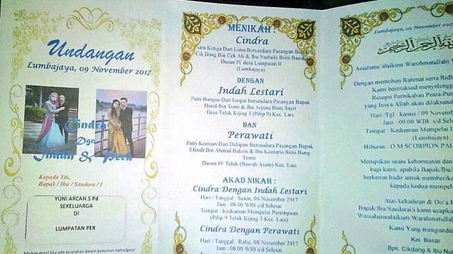 Pada undangan tersebut tertulis pemuda bernama Cindra yang akan melangsungkan prosesi akad nikah dengan Indah Lestari pada Senin (6/11/2017) mendatang. Selang beberapa hari kemudian, Cindra juga melangsungkan akan nikah dengan Perawati pada Rabu (8/11/2017).