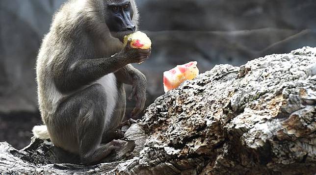 Seekor babon memakan buah beku di kebun binatang Bioparc di Valencia. Italia (23/7). Pemberian makanan beku ini dikarenakan suhu panas yang melanda Italia.